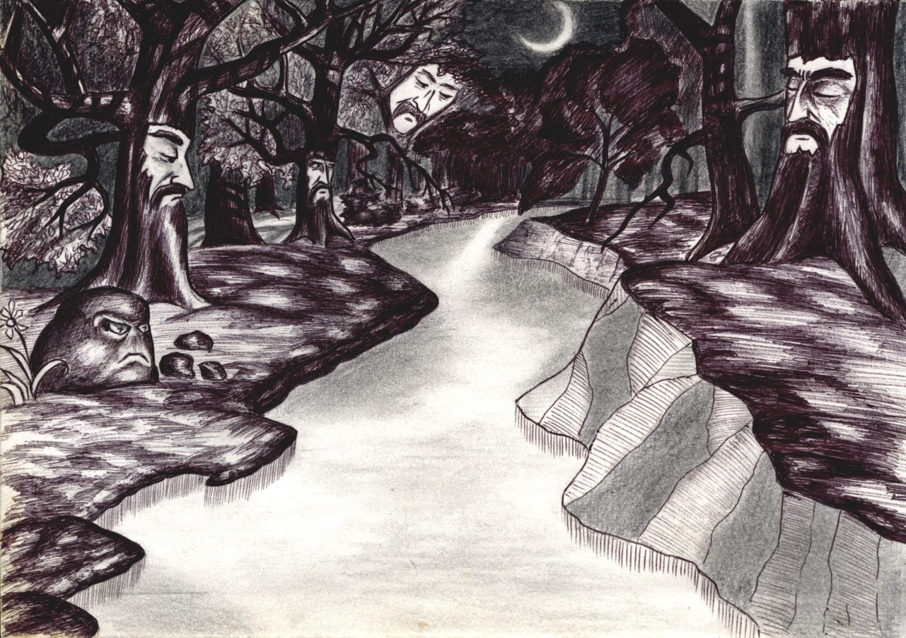 А ночь была нескончаема, так же как и речка, бегущая посреди леса, все дальше уносящая меня в его заброшенный полумрак. Здесь деревья были особенно древние, с бородатыми лицами, покрытыми мхом, с корявыми ветками, спускавшимися к воде, на которых листья были какого-то коричневатого цвета. Возможно, они когда-то и были зелеными, лет этак триста назад.