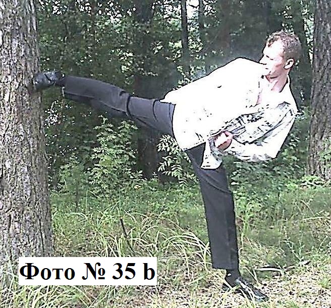 7). Для усиления боковых ударов, вы можете использовать определённые перестановки ногами. Первый способ: вам нужно опорной ногой посредством небольшого прыжка встать на место бьющей ноги Фото №№ 35а, 35b.