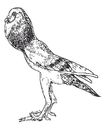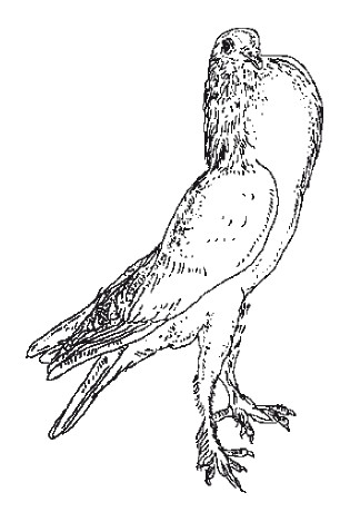 Как уже упоминалось, у этих голубей прямая стойка, стройная фигура и длинные ноги. В предпяточной части ноги голые, красные. Длина их от коленного сустава до конца среднего пальца около 130–170 мм; поставлены они должны быть как можно уже.