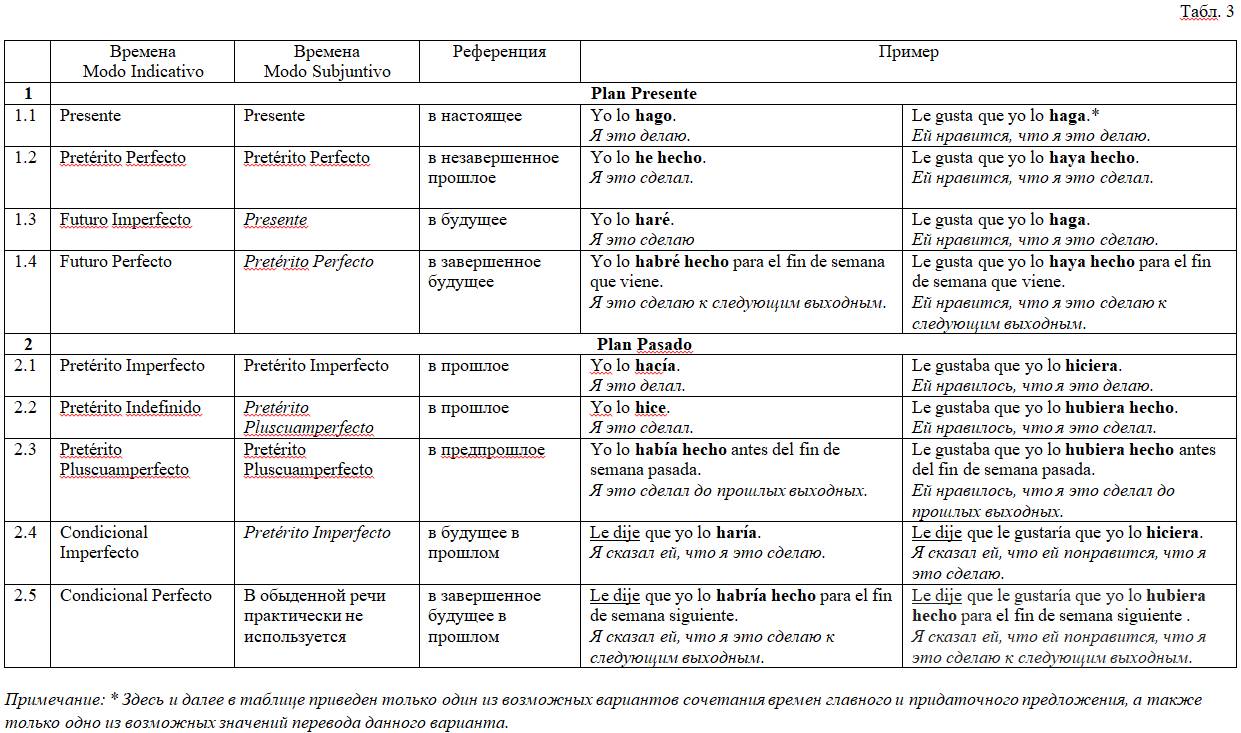 2. Зеркальность этих двух наклонений во временных планах показывает на необходимость согласования времен Modo Subjuntivo со временами Modo Indicativo в рамках указанных планов. Другими словами, как правило, времена Modo Subjuntivo из Plana Presente применяются со временами Modo Indicativo из Plana Presente, времена Modo Subjuntivo из Plana Pasado применяются со временами Modo Indicativo из Plana Pasado.