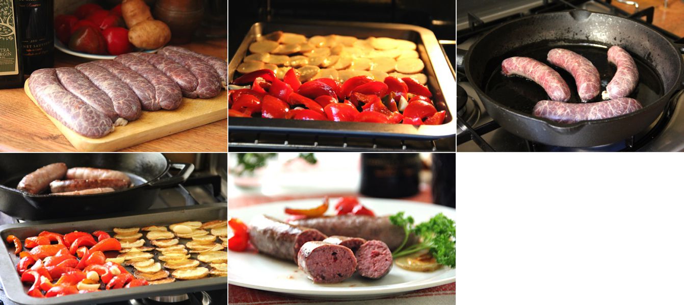 ЖАРЕНАЯ КОЛБАСА ИЗ ЛОСЯТИНЫ С ПЕЧЕНЫМИ ОВОЩАМИ