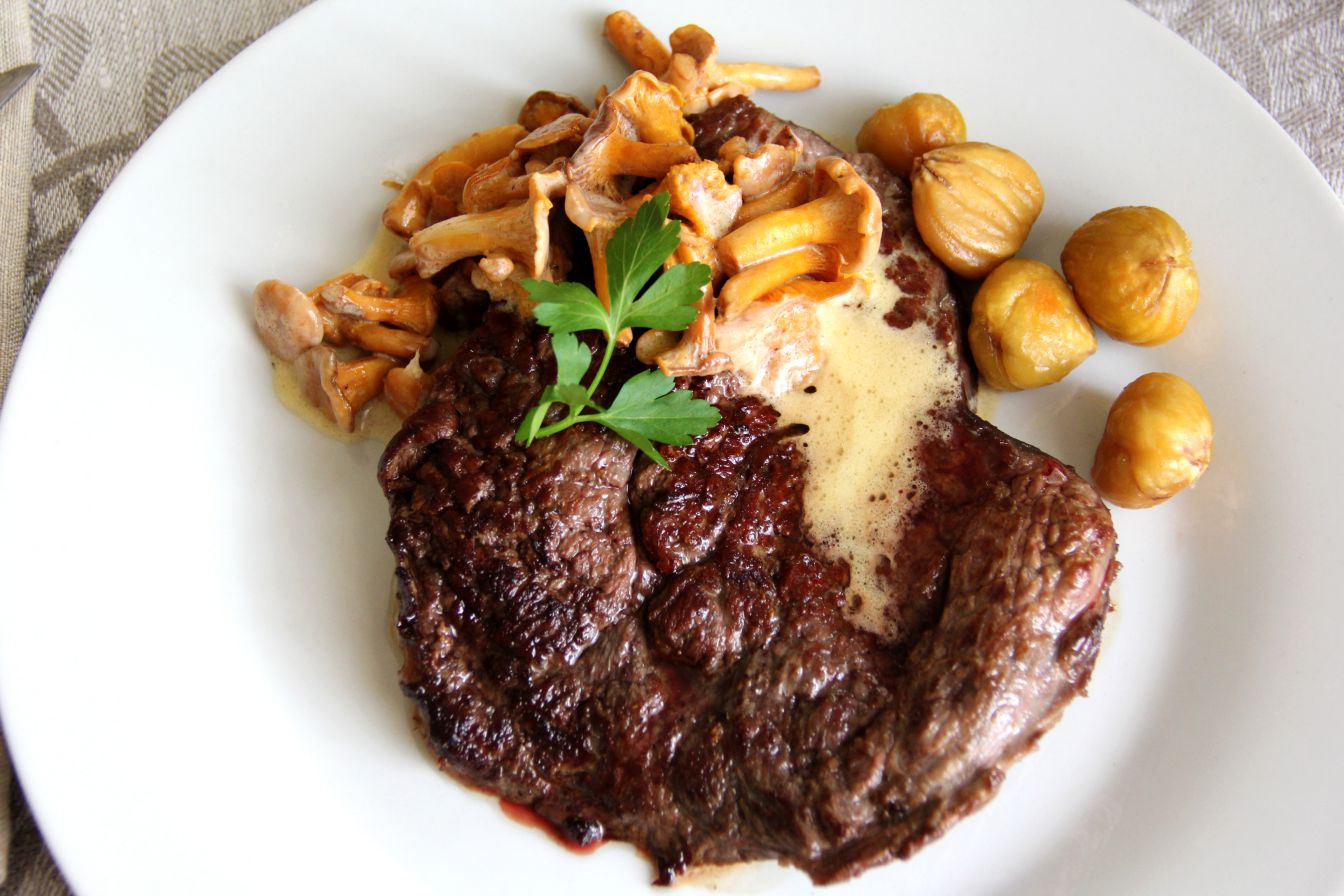 Стейки отбить, посолить и поперчить. Разогреть в большой сковороде 1 ст.л. топлёного масла и обжарить стейки с обеих сторон по 2 минуты. В это же время на другой сковороде разогреть оставшееся масло и обжарить вымытые и обсушенные лисички в течение 4—5 минут. Затем добавить к грибам сметану, соль и перец, довести до кипения и снять с огня. Переложить горячие стейки на тарелки, полить сливочно-грибным соусом, в качестве гарнира подать печёные каштаны или жареный картофель. Украсить блюдо свежей зеленью.