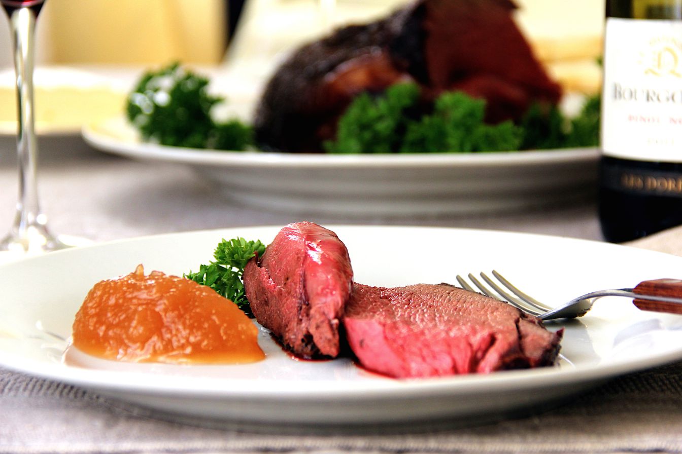 Соль, перец, чабер, можжевеловые ягоды, душистый перец и лавровый лист смешать с вином. Натереть мясо лося смесью специй с вином, завернуть в пищевую пленку и оставить в холодильнике на 12—24 ч. Выложить мясо в керамическую форму, обложить кусочками топленого масла и поставить в разогретую до 180°С духовку на 1 час, затем убавить температуру до 160°С и продолжить запекание ещё 1 час. Время от времени поливать мясо образовавшимся соком. Готовое мясо (идеальная температура внутри куска 65°С, если любите мясо «без крови», то время запекания увеличить на 30 минут) переложить на блюдо, украсить зеленью, нарезать на порции. Подавать с яблочным мармеладом, брусничным вареньем или грибным соусом.