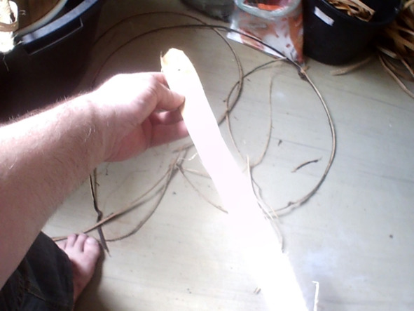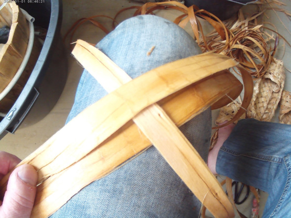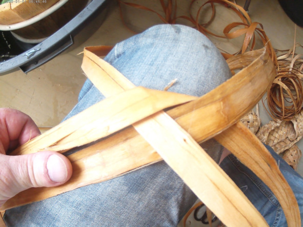 Самое главное мастеру начать заплетать пятку своего лаптя. Лапти у нас лечебные из 3 лычек Липовых, лычки длиной 3 метра. Сначала их заготовить, это, конечно, делается заранее. Молодых Липок, которые растут на болоте Или на очистке. Леса. На коленке складываем коврик из 3 лычек и 1 среднюю лычку, которая идёт вверх. Мы перегибаем через соседнюю лычку и Пропускаем её, как горится в сторону носка, чтоб она ушла назад, 2 лычки у нас остались, которые смотрят вперёд. Справа и слева вот эти 2 лычки которые смотрят вперёд мы загибаем на 180 градусов и заплетаем назад рядом с этими 2 которые там у нас уже есть