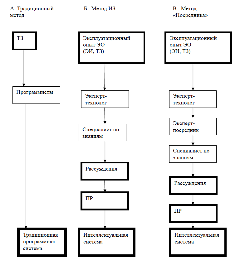 При сравнении различных типов взаимодействия разработчиков нужно учитывать сложность внесения коррекций в уже разработанную систему. При вариантах Б и В такие коррекции даются относительно легко – требуется несколько изменить формализмы рассуждений: исключить некоторые рассуждения, ввести новые рассуждения, внести исправления в некоторые рассуждения, например, изменив тексты вопросов. Для варианта А коррекция значительно сложнее – придется исправлять обычные программы практически без участия экспертов-технологов.