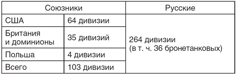 По своей структуре российские дивизии отличаются от союзных. По этой причине мы перевели цифры для российских дивизий в дивизии, эквивалентные нашим. В таблице дается наша оценка общего количества вооруженных сил в Европе по состоянию на 1 июля: