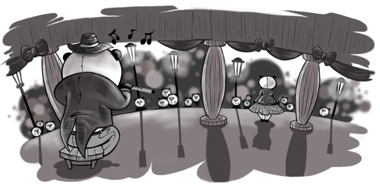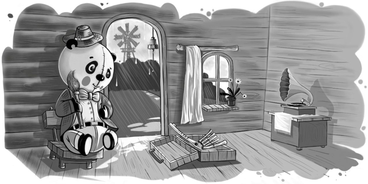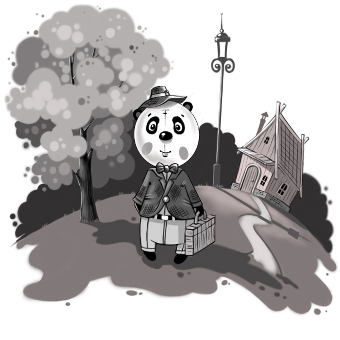 С этими мыслями Панда Бо вышел из дома на чёрно-белую улицу и пошагал к ближайшему холму. Он захватил с собой кисть, побольше сушеного бамбука и, конечно, свою любимую флейту.