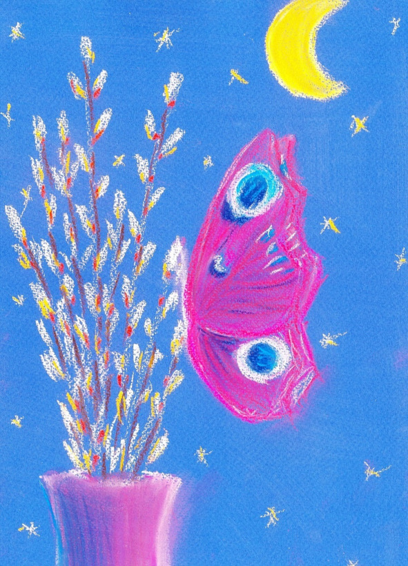 A fluffy willow branch was dozing in a Venetian vase on the windowsill, when a delicate Butterfly appeared on it. The Girl, who couldn’t fall asleep, got up from the bed and went to the window.