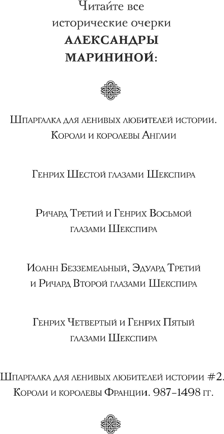 Думаю, не лишним будет повторить то, что я писала в предисловии к английской «Шпаргалке»: этот текст – не учебник истории, ни в коем случае! Это не серьезный научный труд, не глубокое и всестороннее исследование, это именно подручный материал, шпаргалка, в которую можно заглядывать, когда читаешь роман или смотришь фильм, чтобы быстренько сориентироваться: кто есть кто и кто кому кем приходится; почему герцог А ненавидит герцога Б и за что герцогиня В мстит графине Г. Да, в книге приводятся цитаты из трудов профессиональных историков и знаменитых писателей, но я умышленно не делала сносок с указанием года издания и номеров страниц, чтобы текст даже не выглядел «наукообразным». В конце концов, если кому-то из вас станет интересно или нужно – вы легко сами все найдете.