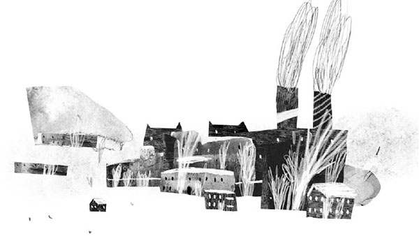 Прямо за окном белые силуэты деревьев, за ними двухэтажные домики. Справа завод с двумя высоченными трубами. Дым из них обычно идет вертикально в небо – пушистый, светло-желтый, а в ветреные дни стелется горизонтально, закрывая половину неба. Алеше нравится представлять, что это гигантские хвосты двух котов. Сами коты небольшие: их тела умещаются в кирпичных коробках завода. А вот хвосты… На заводе работает Алешин папа: варит металл.