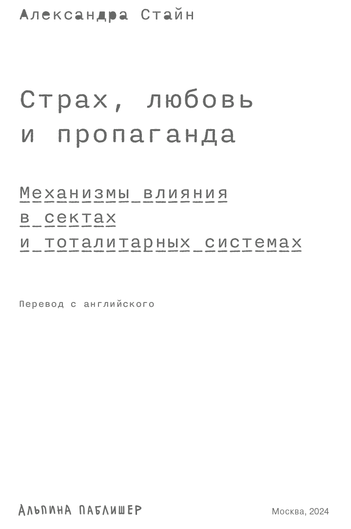 Назвать книгу «Страх, любовь и пропаганда» доктора Александры Стайн злободневной – значит ничего не сказать. И, разумеется, сама автор не рядовой социальный психолог. Она провела целых десять лет в состоянии, как она сама выражается, «анабиоза», попав в тоталитарную секту, которая контролировала всю ее жизнь и всю ее личность. В своей книге «Наружу» (Inside Out), вышедшей в 2002 году, она ярко и убедительно описывает чувство «губительной пустоты» – результат настолько мощного и тотального психологического манипулирования, что оно грозило разрушить саму ее душу. Но душа уцелела. Александре удалось сбежать.