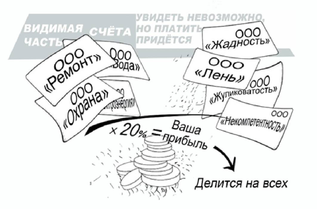 Причем в ООО «Электроэнергия» тоже участвуют свои ООО «Лень», ООО «Жад ность», ООО «Некомпетентность», в ООО «Газ» – свои ООО «Лень», ООО «Жадность», ООО «Некомпетентность» и так далее. И еще неизвестно, что дороже нам обходится и на сколько тянет то, что нельзя увидеть.