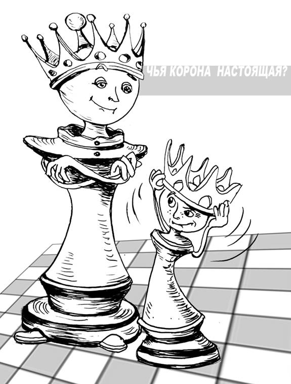 Вот ее корона будет настоящая, у всех остальных она бумажная, как на праздновании дня рождения. В такой короне пешка еще страннее выглядит, чем без нее, у нее потенциал и возможности от пешки, а самомнение от ферзя.