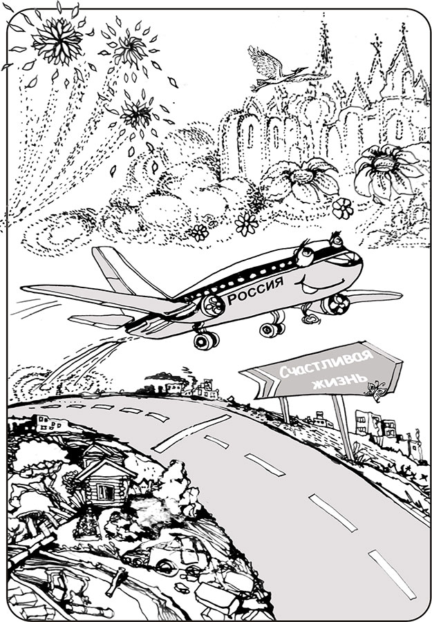 Это похоже на то, как шикарный белый авиалайнер, переливающийся на солнце бриллиантовым сиянием, раскрашенный в цвета российского флага, с надписью «Россия», подъехал к взлетной полосе. Чтоб не платить за перевес, страна избавляется от тяжелого груза прошлого. Этот лайнер заправлен топливом, которого больше ни у кого нет. Это топливо не продается, а выработано предками и самим народом нашей страны.