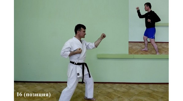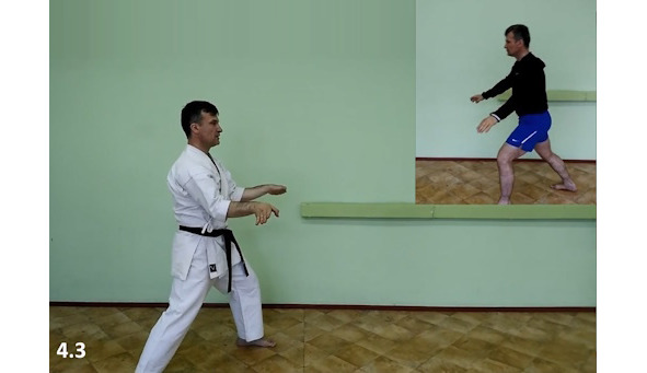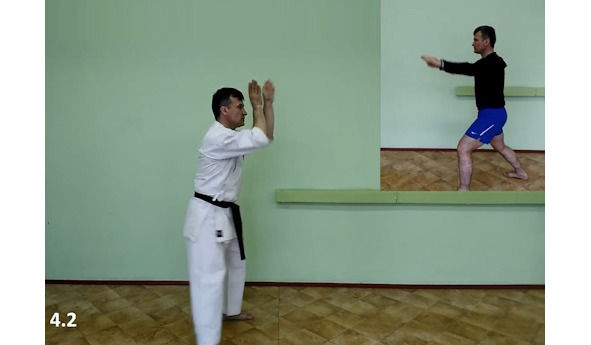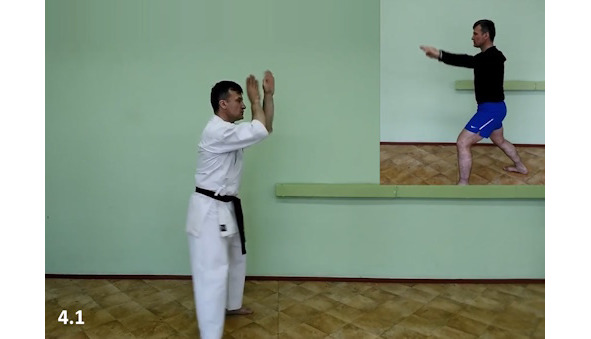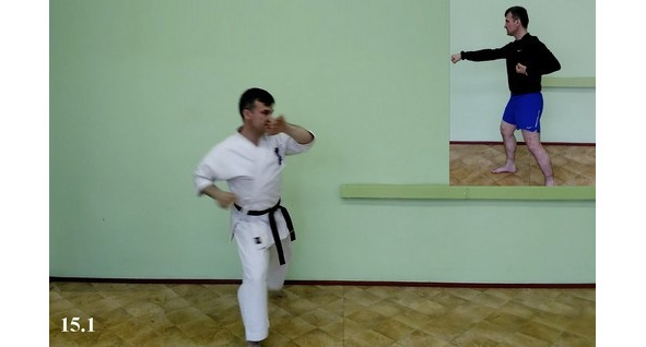 (защита) Отход назад левой ногой влево (!) на 90 градусов (вес при этом смещается на левую согнутую ногу, а правая прямая) с диагональным блоком вниз правой (Ура Дзенкутсу-Дачи и SEIKEN MAE GEDAN BARAI).