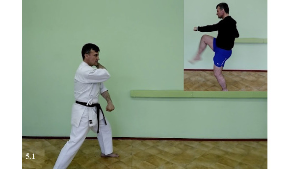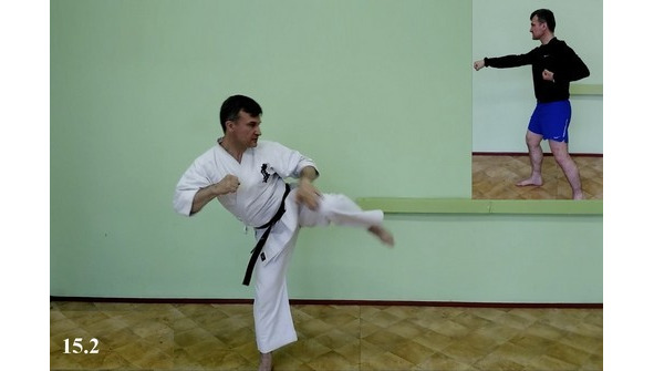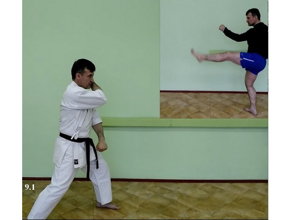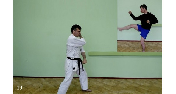 (нападение) имея опущенные и заблокированные руки наносит правой ногой удар между ног противнику (KIN GERI) (и остаться после него на левой ноге с согнутой правой)