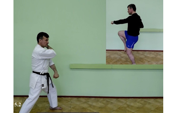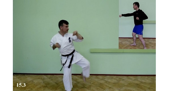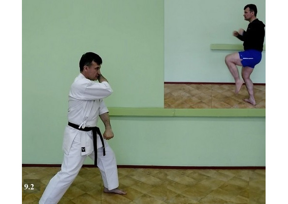 (защита) переносим вес на правую ногу (и сгибаем ее) и (разворот вправо в МИГИ-ДЗЕНКУТСУ-ДАЧИ) и осуществляем своей левой рукой Захват за шею оппонента (с его левой стороны) и наносим удар левым коленом в область печени оппоненту. Важно: ваше бедро в момент удара должно располагаться параллельно земле (HIZA MAVASHI GERI). После удара левая нога ставится вперед (на место расположения оппонента) с толчком левым локтем самого оппонента от себя.