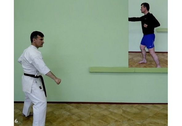 (нападение). Возвращаются в исходную позицию (FUDO DACHI) убирая назад правую ногу и перенося вес на левую заднюю ногу.