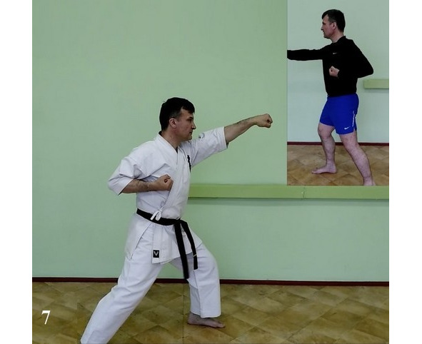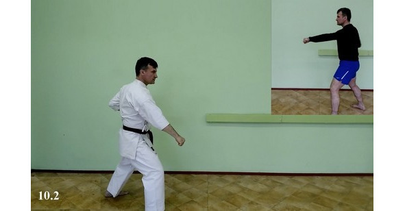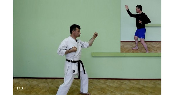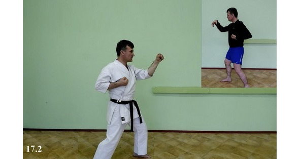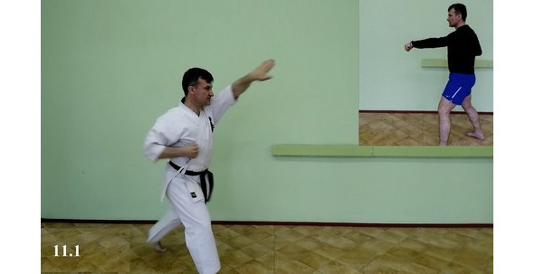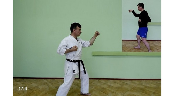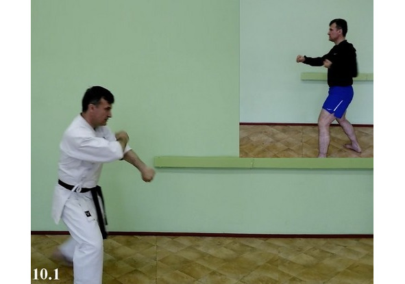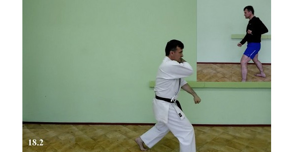 (защита) Необходимо поддаться и сделать по инерции шаг вперед прав ногой со шлепком по полу ступней. При этом одновременно с шагом правую руку быстро размещаем в кулаке у своего левого уха к (подготовка исполнению SEIKEN MAE GEDAN BARAI).