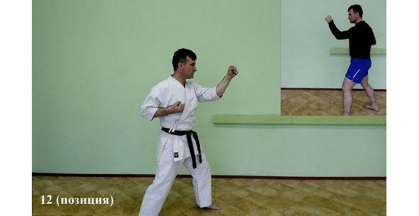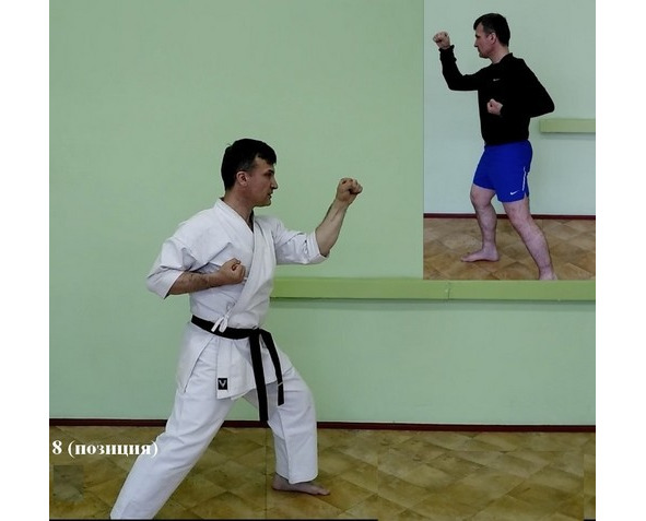 (защита) Сохраняя расположение ног (передняя и задняя) разрываем дистанцию (отходим назад) в промежуточную левостороннюю Позицию (хидари).