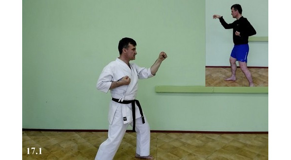 (защита) С шагом правой ногой вперед (на опережение) проводит двойной удар обеими руками (кулаки прижаты друг к другу) в грудь оппонента (SEIKEN MOROTE TSUKI CHUDAN). Важно этот удар нанести еще до того, как руки нападающего выпрямятся и коснутся защищающегося.
