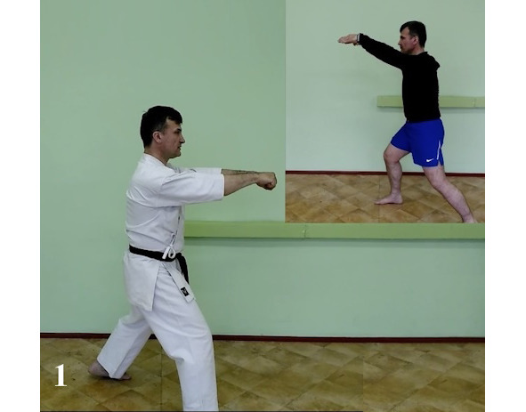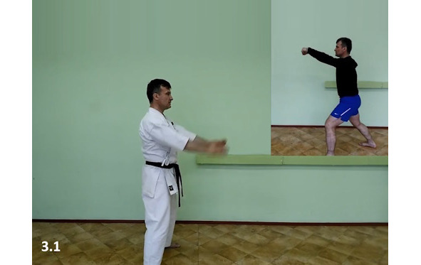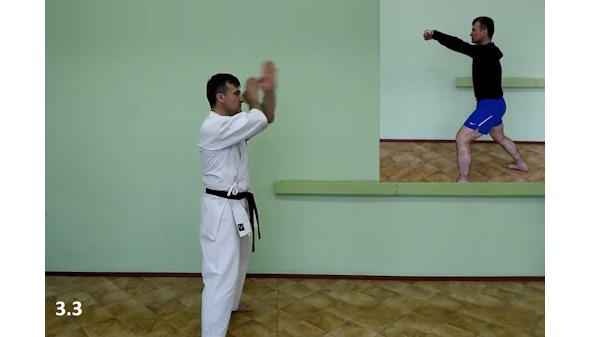 (нападающий) Лев ногой шаг вперед и медленный удар двумя руками в голову (SEIKEN MOROTE TSUKI JODAN). Важно при отработке делать это движение медленно, давая оппоненту возможность отработать ощущение дистанции и техническую защиту.