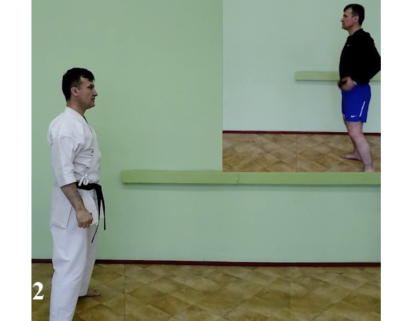 ИП. Исходная позиция для обоих партнеров ноги на ширине плеч и руки опущены сжаты в кулаках (FUDO DACHI).