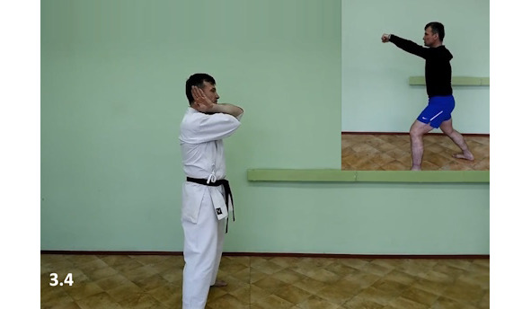 (защита) Шаг вперед лев ногой (за спину оппонента) и наносим левой рукой удар в голову (имитация) прямой левой (SEIKEN OI TSUKI JODAN).