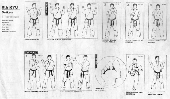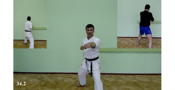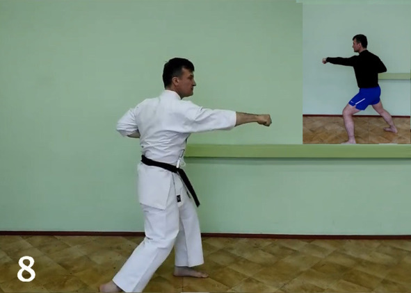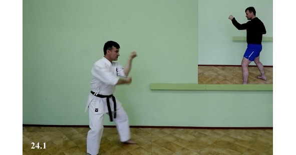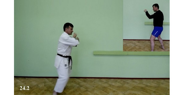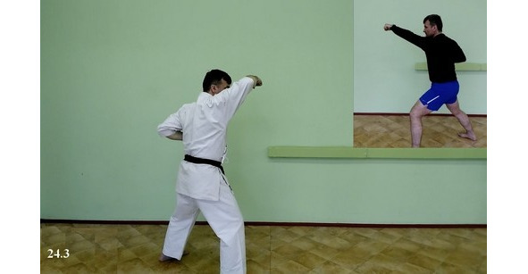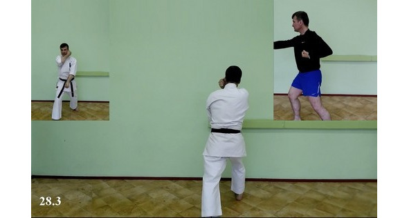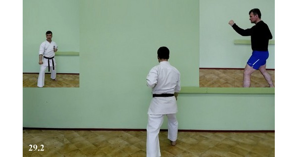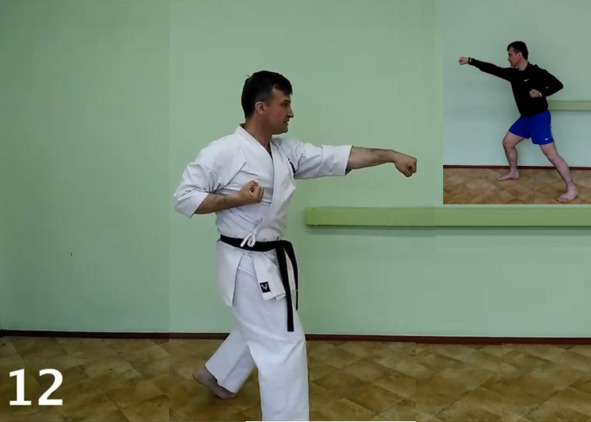 (нападение). Правая нога после удара ставится вперед и правой рукой (одноименной с правой ногой) делается удар кулаком в уровень груди оппоненту (SEIKEN OI TSUKI CHUDAN правой)