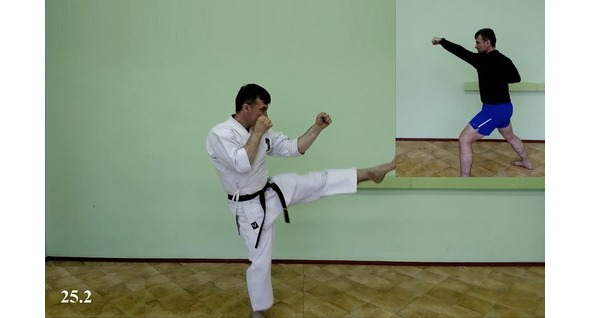 (защита) Удар левой ногой подушечками ступни в область груди оппонента (CHUDAN MAE GERI CHUSOKU левой). После удара левая нога ставится вперед.