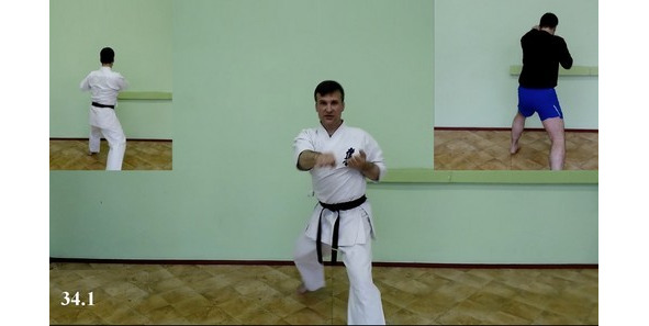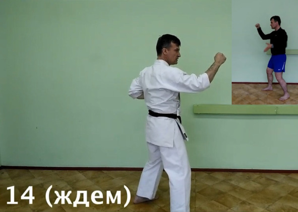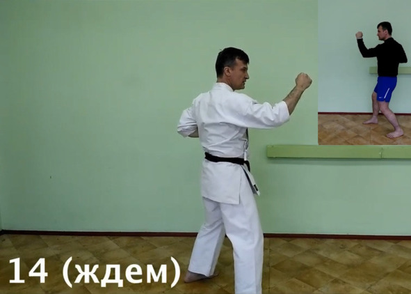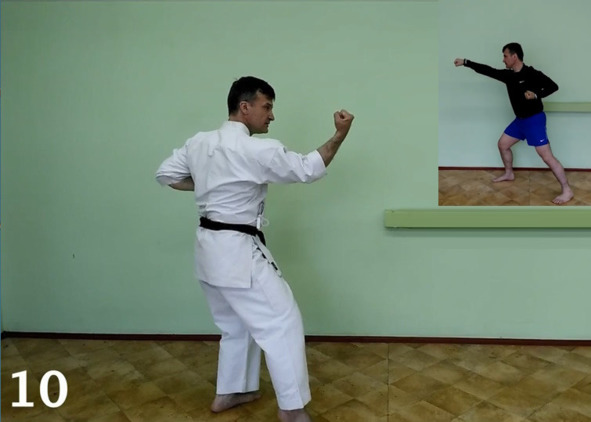(защита) Отшаг правой ногой чуть назад (левая на месте, а правая ступня делает небольшое движение) и правый кулак закрывает пах, а левая рука готовится к следующему блоку и ставится к левому уху)