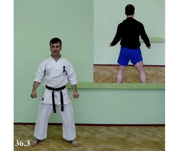 (защита) Исходное положение принимаем перенесением веса на заднюю ногу и подтягиванием на одну с ней линию передней ноги (FUDO DACHI).