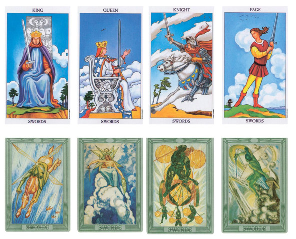 В Таро Тота четыре ранга Фигурных карт называются: Рыцарь, Королева, Принц и Принцесса. В Таро Уайта: Король, Королева, Рыцарь, Паж. То есть Рыцарь Тота – это Король Уайта, а Рыцарь Уайта – это Принц в Таро Тота. Еще сильнее все осложняется в тех случаях, когда в конкретных изданиях колоды названия меняет издатель – например Рыцаря Таро Тота могут назвать Королем. И, словно этого мало, некоторые авторы книг по Таро, пишущие о Таро Уайта, могут менять местами ранги Короля и Рыцаря. Поэтому часто не достаточно просто названия ранга – нужно еще уточнить, а какой колоде идет речь, а лучше посмотреть своими глазами, чтобы точно знать, что это за карта.