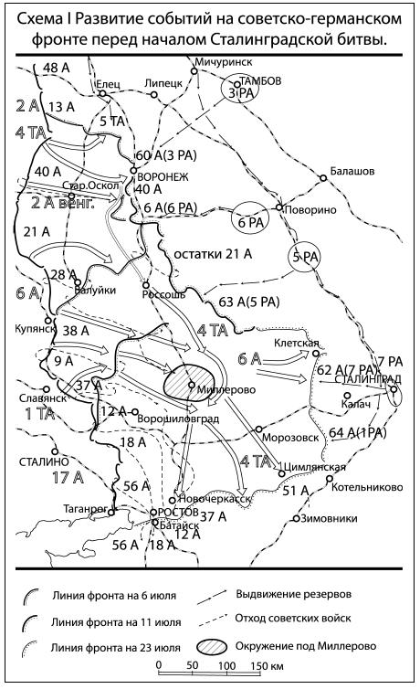 С оперативной точки зрения Сталинградскую битву можно условно разделить на три больших периода. Первый – это маневренное сражение на дальних подступах к городу. Он охватывает промежуток времени примерно от середины июля до конца августа 1942 г. Второй период – это бои за город и контрудары Сталинградского фронта по флангу 6-й армии. Данный период самый продолжительный и занимает временной интервал от конца августа до 19 ноября 1942 г. Однако следует отметить, что интенсивность боевых действий в этот период постепенно снижалась. Наконец, третий период – это окружение армии Паулюса, отражение попытки Манштейна ее деблокировать и уничтожение окруженных войск в ходе операции «Кольцо». Последний период простирается от 19 ноября 1942 г. до 2 февраля 1943 г. Соответственно книга разделена на три части, в каждой из которых повествование разделено по направлениям и в хронологическом порядке.