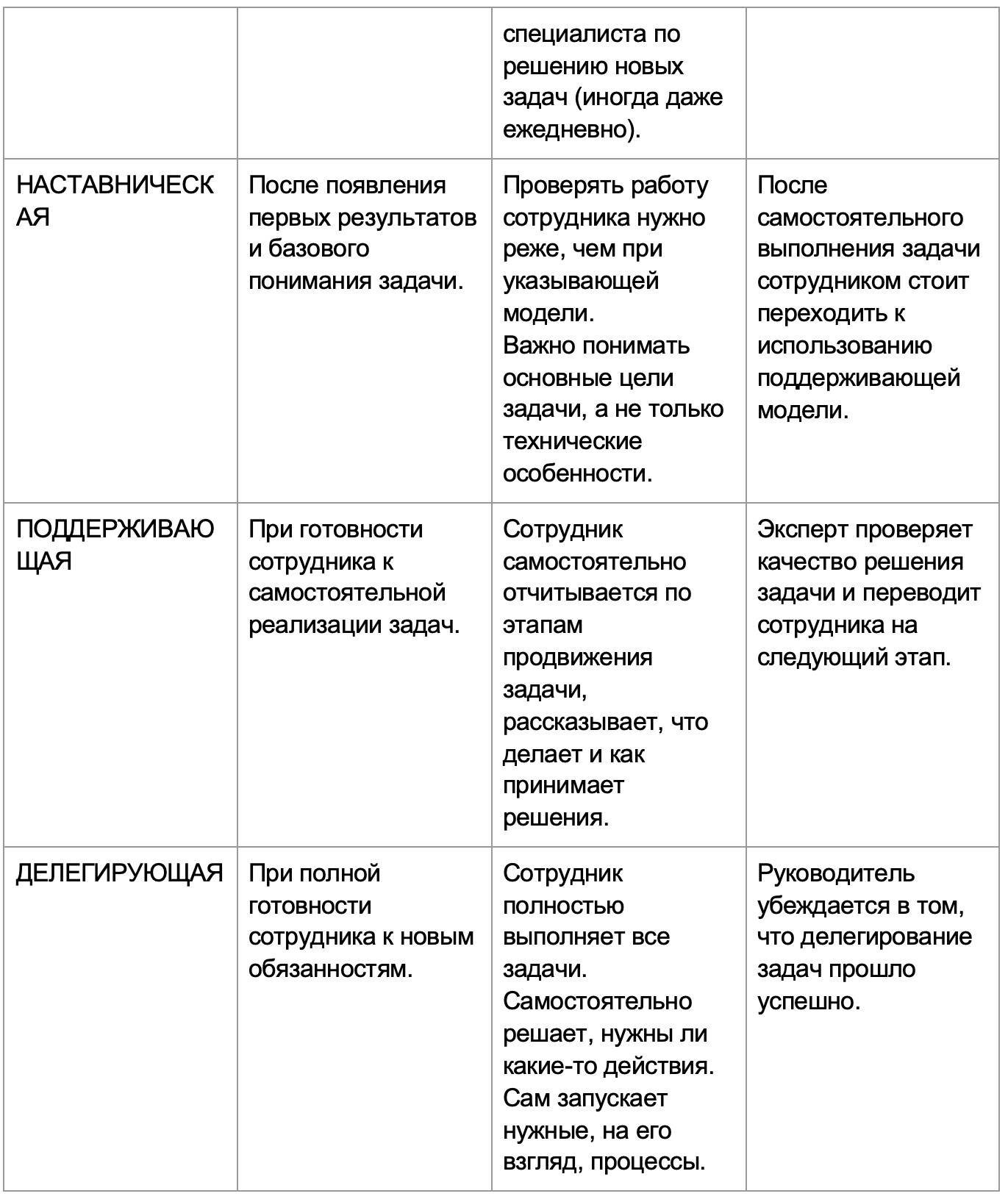 При делегировании задач руководитель может использовать модель Херши-Бланшера: указывающую, наставническую, поддерживающую и делегирующую.