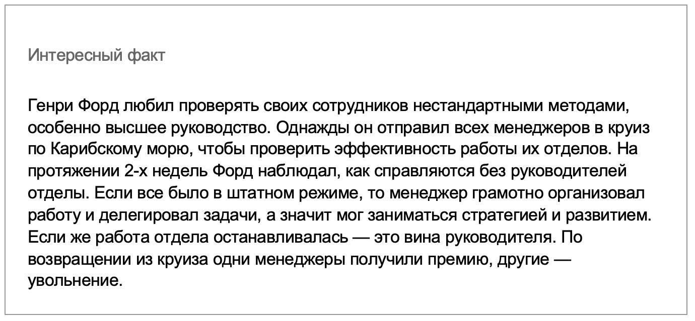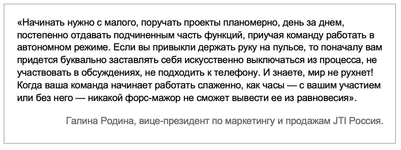 В компании «Евросеть», например, были введены определенные правила, связанные с делегированием. В ней тщательно следили за руководителями отделов. Если кто-то из менеджеров перерабатывал, ему рекомендовали перераспределить нагрузку между подчиненными. Если это не помогало, руководителю выделяли помощника, которому тот был обязан передать часть своих задач.