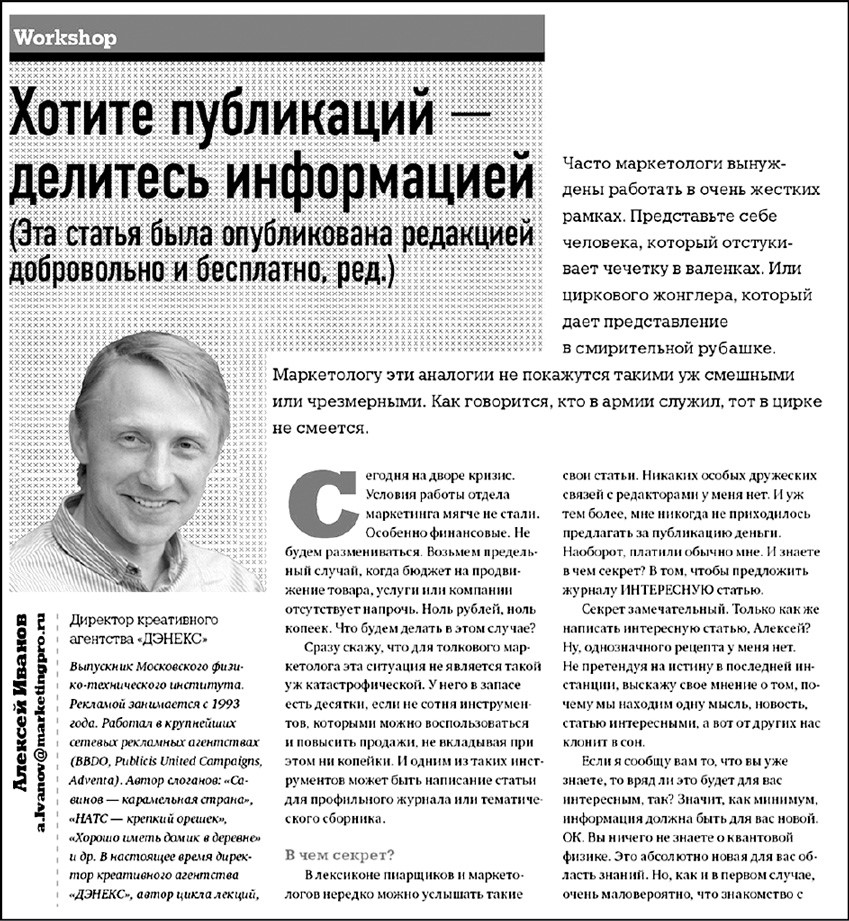 И знаете, в чем секрет? В том, чтобы предложить журналу интересную статью. Вот так, например, выглядела моя работа на эту же тему в журнале «МаркетингPRO» (рис. 1.1). Ее подзаголовок: «Эта статья была опубликована редакцией добровольно и бесплатно». В исходном варианте его не было. Он был добавлен самой редакцией как наглядное доказательство того, о чем я писал.