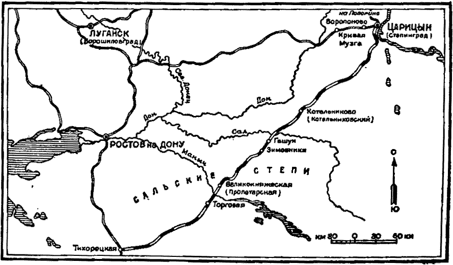6То, что говорил Сталин в вагоне Ворошилову, оправдалось: в конце июня армия Деникина нанесла ряд сильных ударов по магистрали Царицын – Тихорецкая и отрезала пятидесятитысячную армию Калнина. Южный фронт тем самым привлек теперь все внимание.