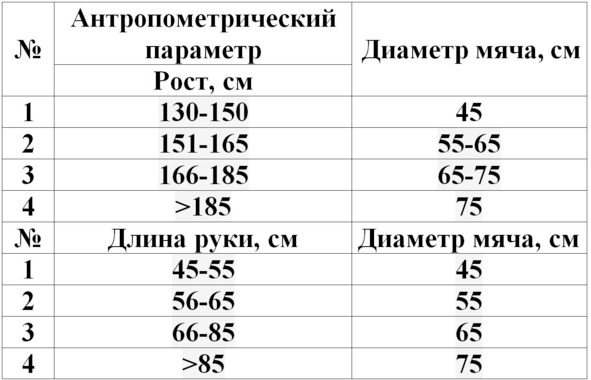 Таблица 1. Выбор фитбола по росту и длине рук.