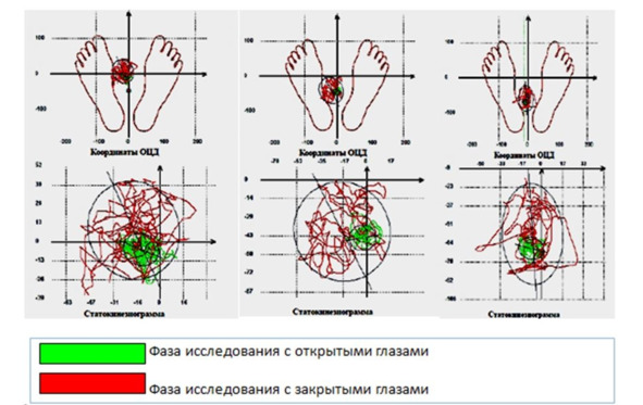 Представленные статокинезиограммы наглядно демонстрируют более выраженные отклонения от баланса равновесия при проведении фазы исследования в позе Ромберга с закрытыми глазами. Под позой Ромберга подразумевают несложный диагностический тест, направленный на выявление нарушений функций систем органов, участвующих в поддержании равновесия. К этим системам относится вестибулярный аппарат (мозжечок и внутреннее ухо), система проприорецепции (глубокой чувствительности), высшие мозговые функции коры мозга. Таким образом, поза Ромберга позволяет выявлять как нарушения со сто-роны вестибулярного аппарата, так и иные патологии (поражение спинного мозга, полинейропатии, психиатрические нарушения и т. д.).