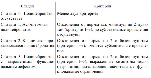 Таблица 2. Критерии диагностики и стадии полинейропатии по P. J. Dyck.