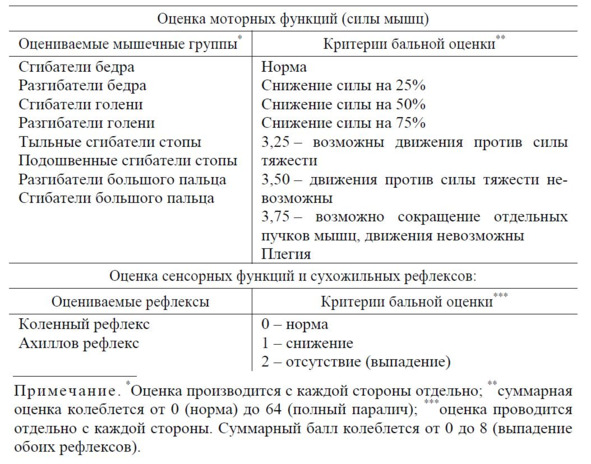 Оценка моторного компонента включает в себя оценку мышечных групп: сгибатели бедра, разгибатели бедра, сгибатели голени, разгибатели голени, тыльные сгибатели стопы, подошвенные сгибатели стопы, разгибатели большого пальца, сгибатели большого пальца. Показатель оценки моторного компонента выражается в баллах от 0 до 4. Оценка сенсорных функций и сухожильных рефлексов включает в себя оценку коленного и ахиллова рефлексов в баллах от 0 до 2. Оценка производится с каждой стороны отдельно. Суммарная оценка моторного компонента нейропатии колеблется от 0 (норма) до 64 (полный паралич) баллов. Суммарный балл сенсорного компонента колеблется от 0 до 8 (выпадение обоих рефлексов) баллов.