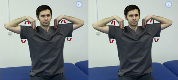 Рисунок 13. Упражнение лечебной физкультуры, используется стол для Войта-Бобат терапии: исходное положение «сидя», руки согнуты в локтях, кисти приведены к плечам, производим поочередно вращение руками вперед (1) и назад (2). Выполняем в течение 5 мин.