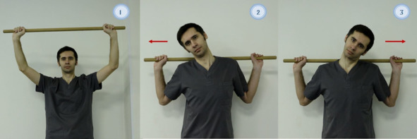 Рисунок 14. Упражнение лечебной физкультуры, используется гимнастическая палка: 1. Исходное положение «стоя» или «сидя», руки слегка согнуты в локтях, подняты вверх над головой, в руках гимнастическая палка длиной 90—100 см.; 2—3. Гимнастическая палка опускается за спину, выполняются наклоны головы поочередно в стороны с задержкой в положении на 10—15 сек. Вся комбинации повторяется 5—10 раз.