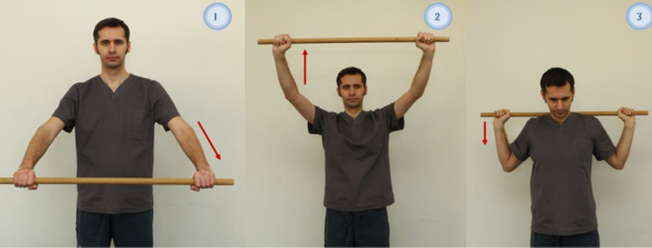 Рисунок 15. Упражнение лечебной физкультуры, используется гимнастическая палка: 1. Исходное положение «стоя» или «сидя», выпрямленные вперед руки опущены вниз, в руках гимнастическая палка длиной 90—100 см; 2. Руки поднимаем вверх над головой слегка согнув в локтях; 3. Гимнастическая палка опускается за спину; Каждое упражнение выполняется с задержкой в положении на 10—15 сек. Вся комбинации повторяется 5—10 раз.