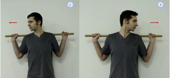 Рисунок 16. Упражнение лечебной физкультуры, используется гимнастическая палка: 1—2. Исходное положение «стоя» или «сидя», в руках гимнастическая палка длиной 90—100 см. Гимнастическая палка опускается за спину, выполняются повороты головы поочередно в стороны с задержкой в положении на 10—15 сек. Вся комбинации повторяется 5—10 раз.