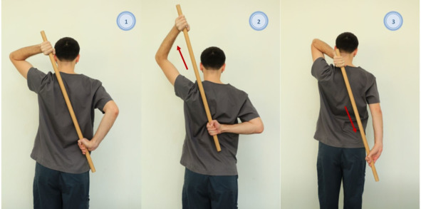 Рисунок 17. Упражнение лечебной физкультуры, используется гимнастическая палка: 1. Исходное положение «стоя» или «сидя», руки согнуты в локтях и заведены за спину (левая руку сверху, правая снизу), в руках гимнастическая палка длиной 90—100 см.; 2—3. Гимнастическая палка поочередно поднимается вверх и опускается вниз с задержкой в положении на 10—15 сек. Вся комбинации повторяется 5—10 раз с изменением положения рук (левая руку сверху, правая снизу/правая руку сверху, левая снизу).