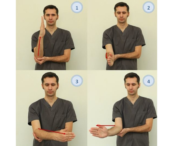 Рисунок 18. Упражнение лечебной физкультуры: 1. Исходное положение «стоя» или «сидя», левой рукой под локоть поддерживаем правую руку. Правая рука согнута в локте; 2—4. Показана смена положения правой руки. Повторяем по 10—15 раз для правой и левой руки.