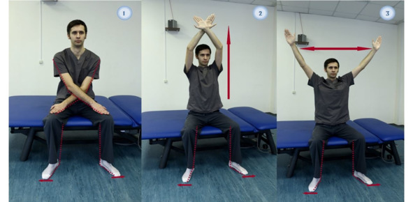 Рисунок 19. Упражнение лечебной физкультуры, используется стол для Войта-Бобат терапии: 1. Исходное положение «сидя» руки сложены в локтях и перекрещены, кисти расположены на бедрах, ноги согнуты в коленных суставах, стопы слегка развернуты кнаружи; 2. Руки подняты вверх, слегка согнуты в локтях и перекрещены, ноги согнуты в коленных суставах, стопы слегка развернуты кнаружи; 3. То же положение с разведенными в стороны и выпрямленными руками. Выполняем упражнение 10—15 раз.