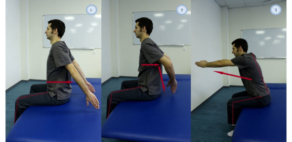 Рисунок 20. Упражнение лечебной физкультуры, используется стол для Войта-Бобат терапии: 1. Исходное положение «сидя», руки выпрямлены отведены за спину, ноги согнуты в коленных суставах, стопы слегка развернуты кнаружи; 2. То же положение, но руки согнуты в локтях, задерживаем положение на 10 сек; 3. Руки выпрямлены вперед, ноги согнуты в коленных суставах, стопы слегка развернуты кнаружи. Тянемся корпусом вперед, оставляя спину прямой, задерживаем положение на 5—10 сек., возвращаясь в исходное. Выполняем 8—10 повторов.